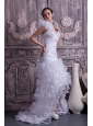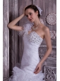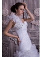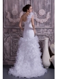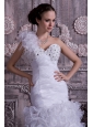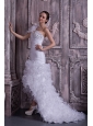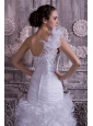 You'll absolutely love this classic one shoulder high-low wedding dress with romantic ruffles and beading. The one shoulder strap is decorated with the tucked organza which definitly shows your elegance. The tucked skirt gives the lower skirt and train a spectacular rippling wave appearance. With a hidden zipper up back the dress is secured in place.