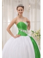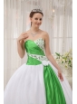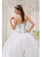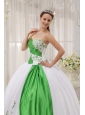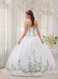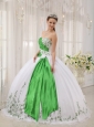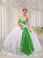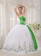 This green and white quinceanera dress is so sweet. At the top, embroidery accents crowed along the strapless sweetheart bodice for a touch of exquisite glamour. A brightly colored waistband brings things full circle. The amazing A-line skirt is reminiscent of the old fashioned applique skirts and adds another dimension of beauty to an already lovely gown. You're sure to adore the eye-catching on the ball.