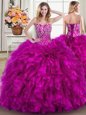 Three Piece Fuchsia Sweetheart Neckline Beading and Ruffles Ball Gown Prom Dress Sleeveless Lace Up