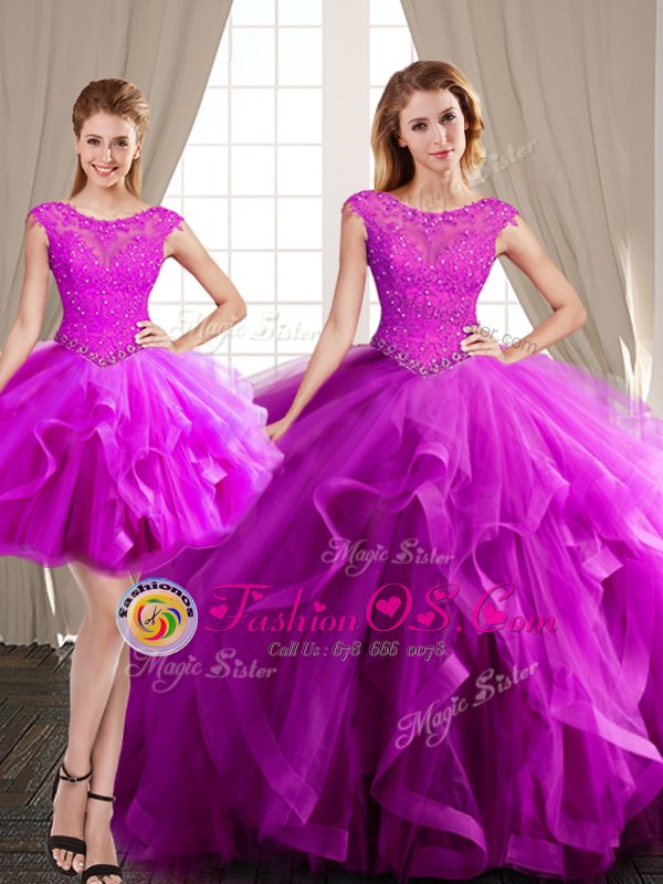 Home >  Quinceanera Dresses >  Detachable Quinceanera Skirts > Three Piece Scoop Fuchsia Cap Sleeves Tulle Brush Train Lace Up Quinceanera Dresses for Military Ball and Sweet 16 and Quinceanera