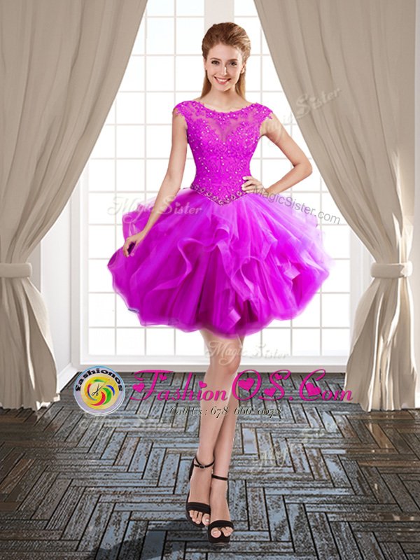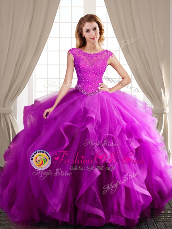 Three Piece Scoop Fuchsia Cap Sleeves Tulle Brush Train Lace Up Quinceanera Dresses for Military Ball and Sweet 16 and Quinceanera