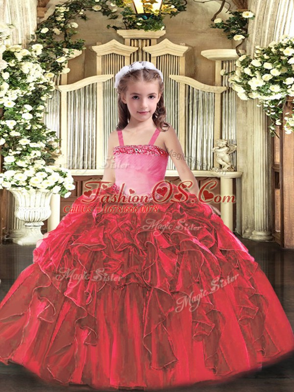Top Selling Appliques and Ruffles Girls Pageant Dresses Red Lace Up Sleeveless Floor Length