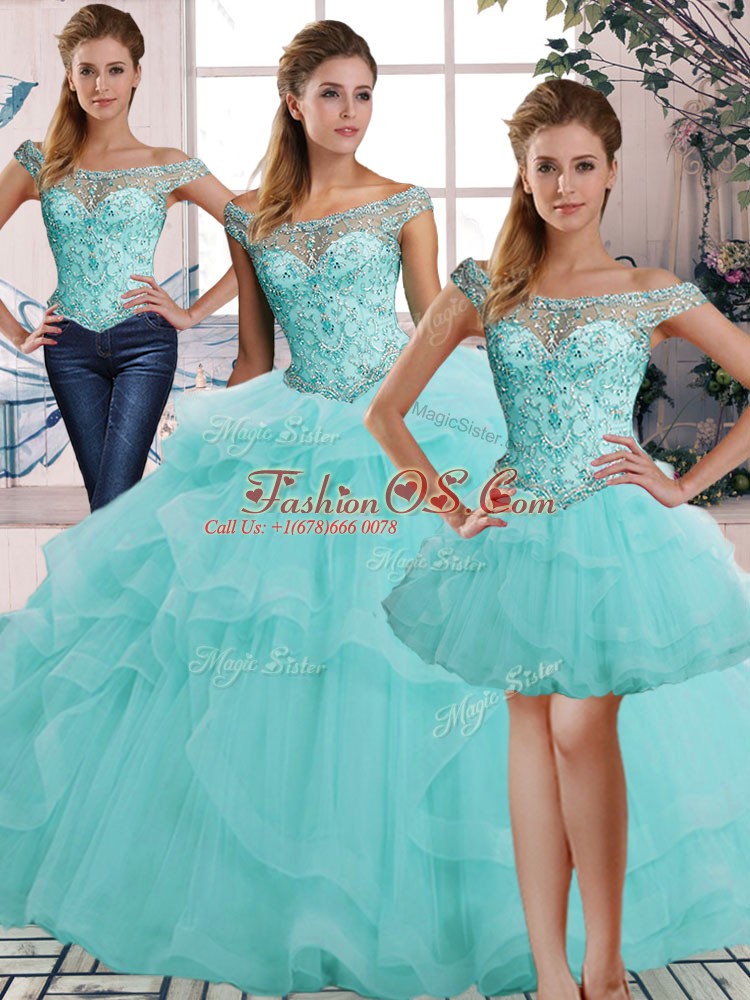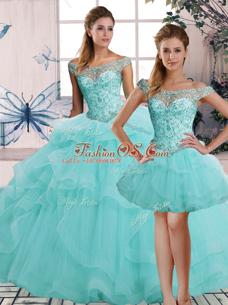 Top Selling Aqua Blue Sleeveless Floor Length Beading and Ruffles Lace Up Sweet 16 Dress