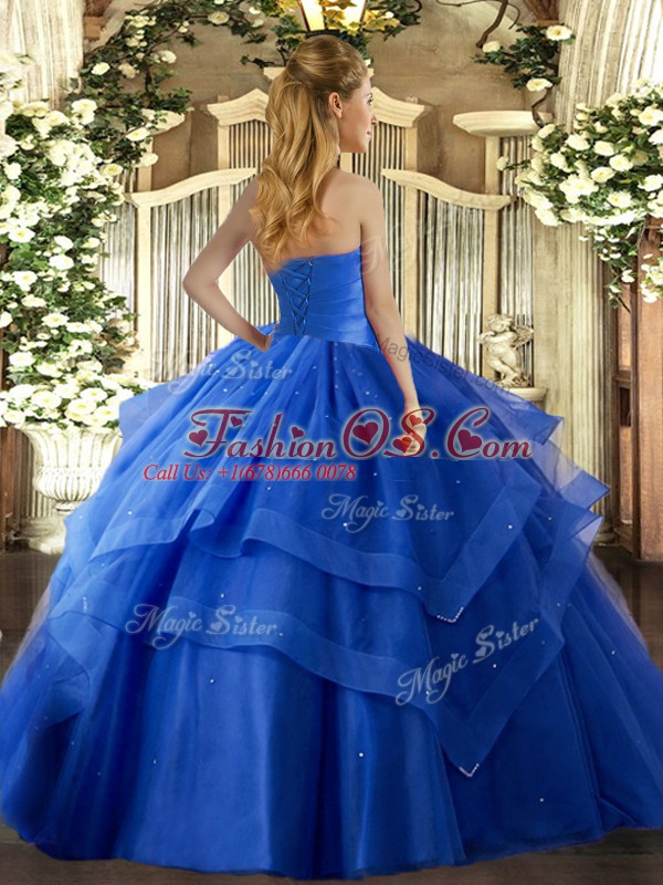 Top Selling Baby Blue Tulle Lace Up Strapless Sleeveless Floor Length Quince Ball Gowns Ruffled Layers