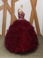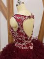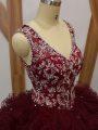 Home >  Quinceanera Dresses >  Puffy Quinceanera Dresses > Top Selling Burgundy Ball Gowns Beading and Ruffles Quinceanera Gown Backless Organza Sleeveless Floor Length