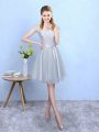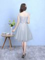 Silhouette: Empire Neckline: v-neck Sleeve Length: cap sleeves Hemline/Train: knee length Back Detail: lace up Embellishment: lace Fabric: tulle Shown Color: silver(Color & Style representation may vary by monitor.) Occasion: wedding party Season: spring,summer,fall Fully Lined: Yes Built-In Bra: Yes
