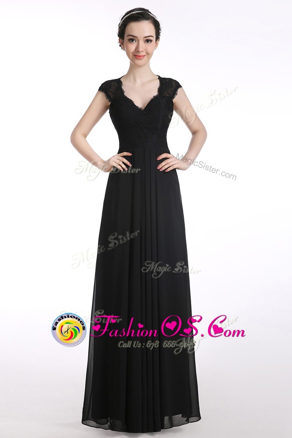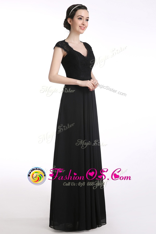 Top Selling Chiffon V-neck Cap Sleeves Zipper Lace Mother Of The Bride Dress in Black