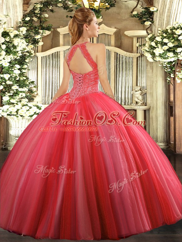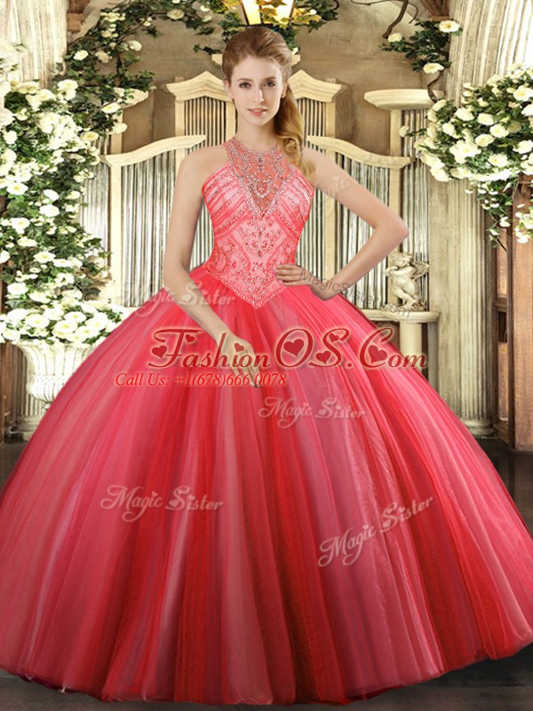 Top Selling Floor Length Ball Gowns Sleeveless Coral Red Sweet 16 Dresses Lace Up