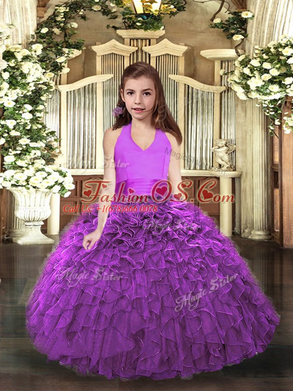 Top Selling Floor Length Eggplant Purple and Purple Child Pageant Dress Organza Sleeveless Ruffles