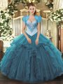 Top Selling Floor Length Lace Up 15 Quinceanera Dress Teal for Military Ball and Sweet 16 and Quinceanera with Beading and Ruffles