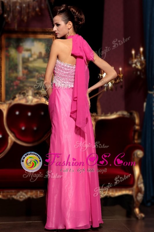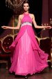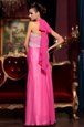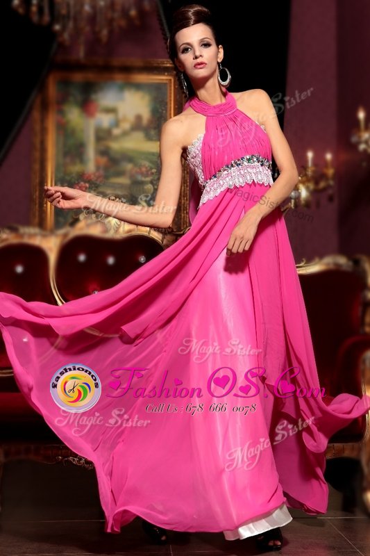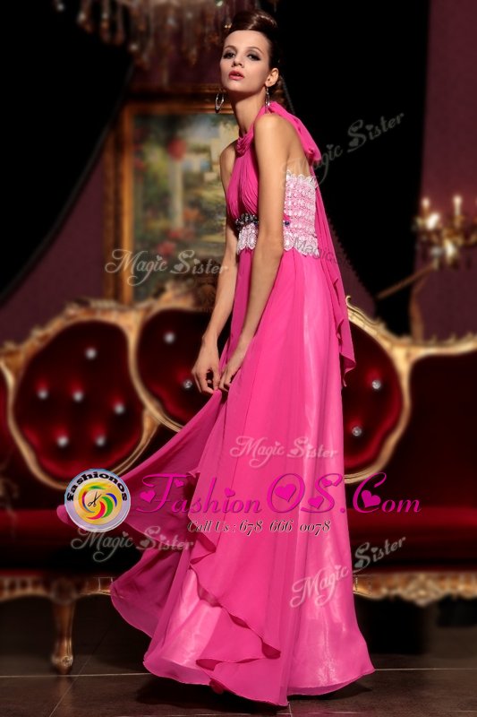 Top Selling Halter Top Sleeveless Chiffon Floor Length Zipper Celebrity Style Dress in Hot Pink for with Beading and Lace