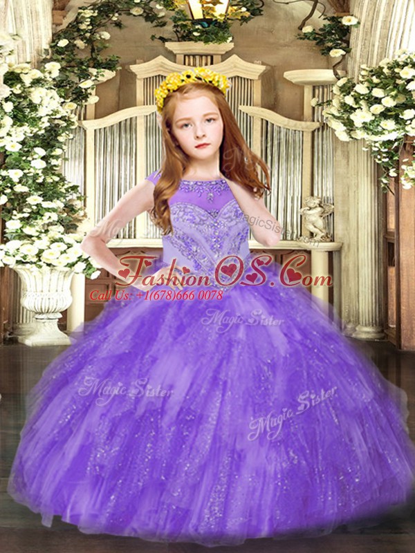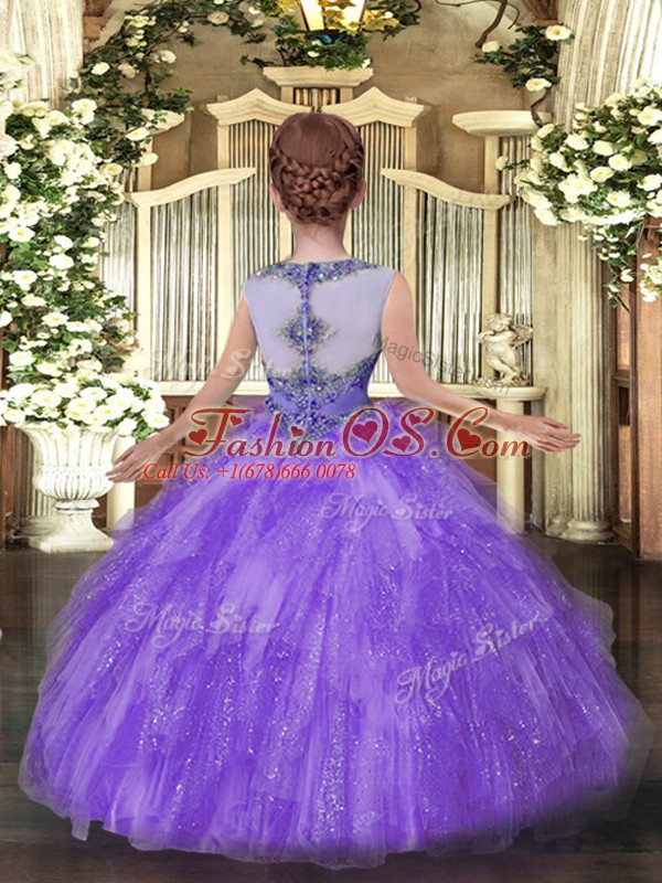 Top Selling Lavender Tulle Zipper Scoop Sleeveless Floor Length Little Girl Pageant Dress Beading and Ruffles