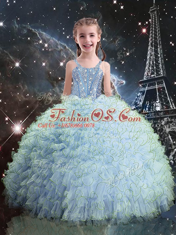 Home >  Special Occasion Dresses >  New Style Little Girl Pageant Dresses > Top Selling Light Blue Ball Gowns Organza Straps Sleeveless Beading and Ruffles Floor Length Lace Up Little Girl Pageant Gowns