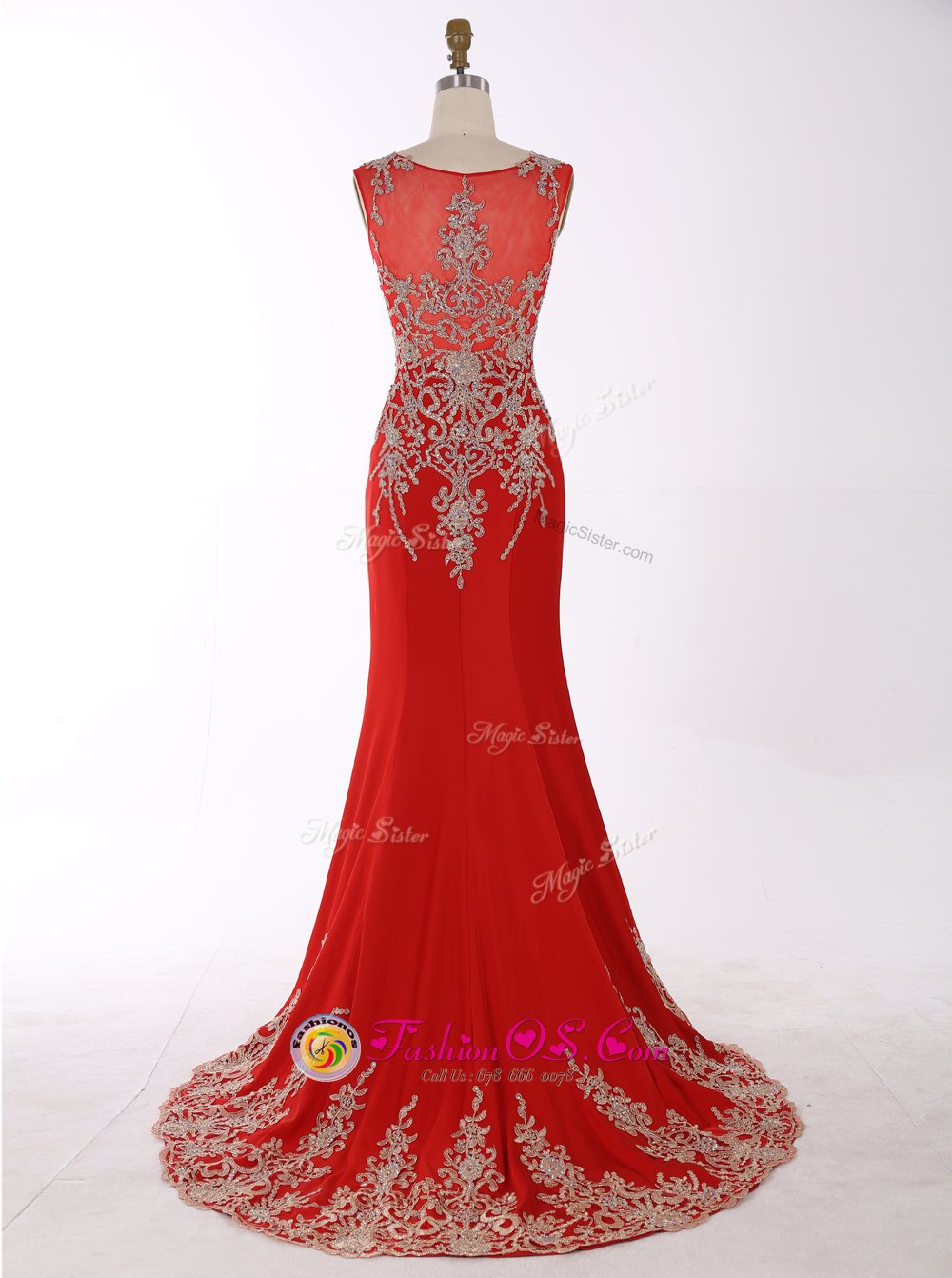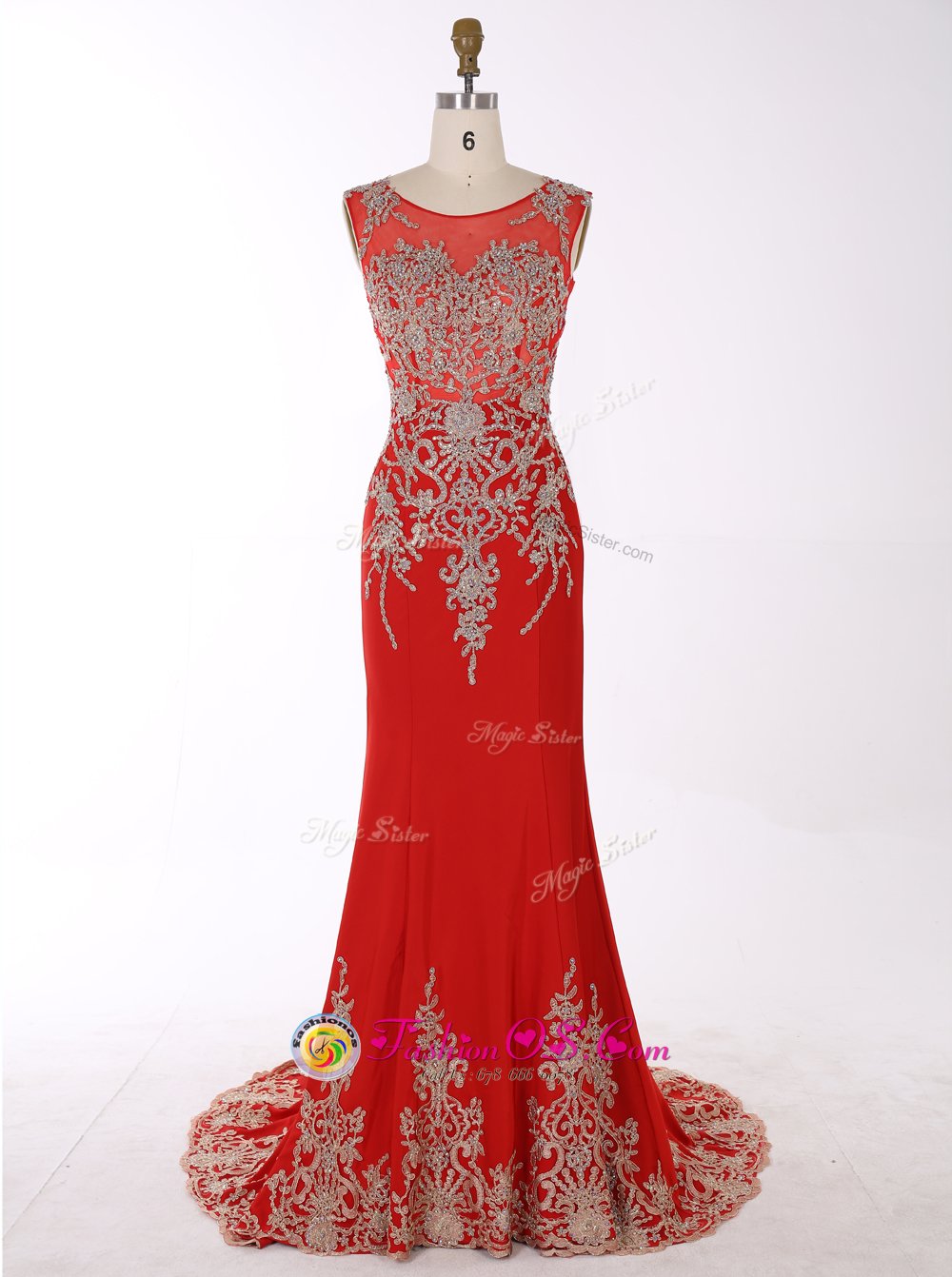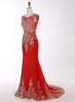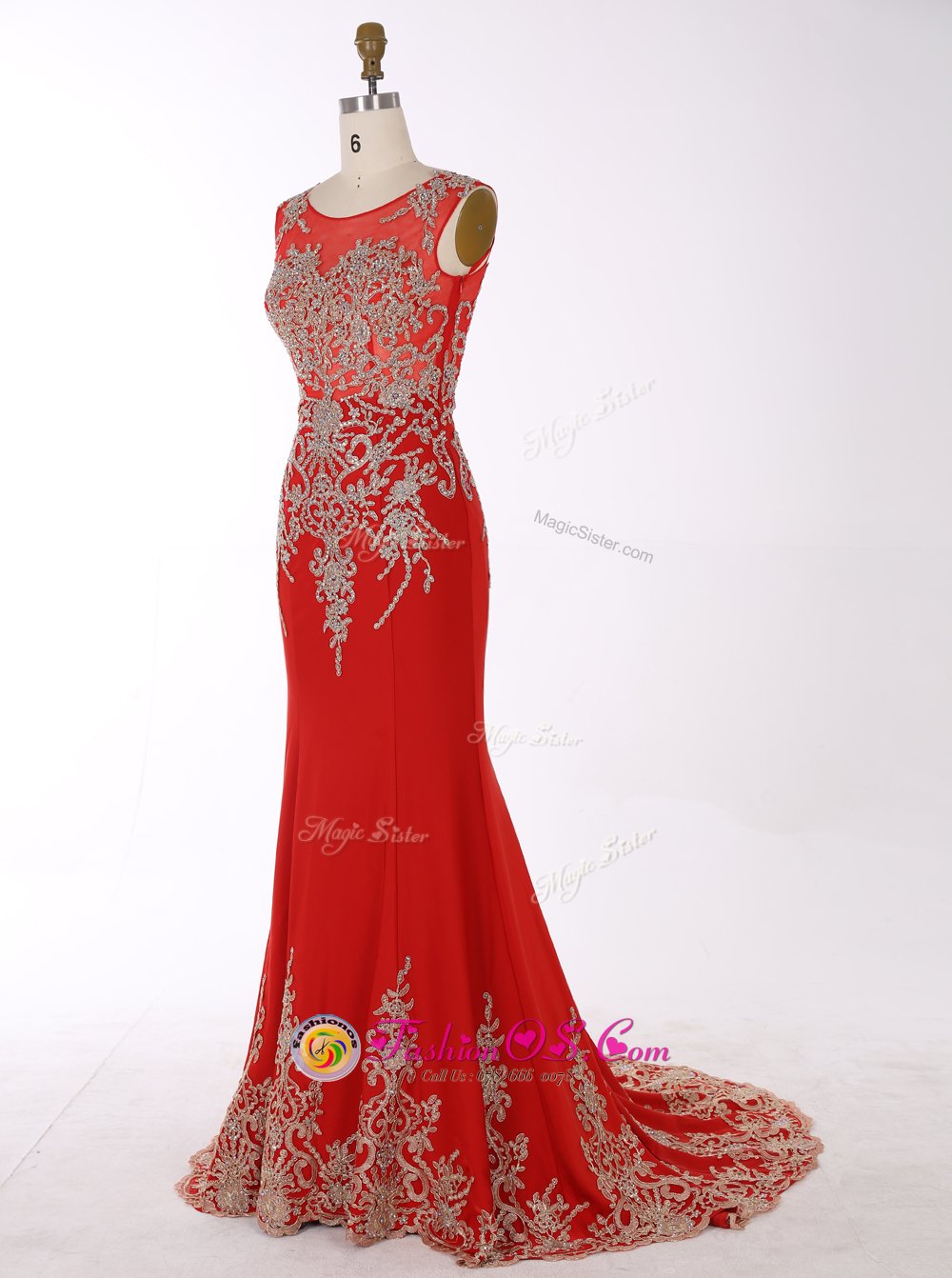 Home >  Prom Dresses >  Perfect Prom Dresses > Top Selling Mermaid Scoop Red Chiffon Zipper Sleeveless With Brush Train Beading and Appliques