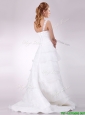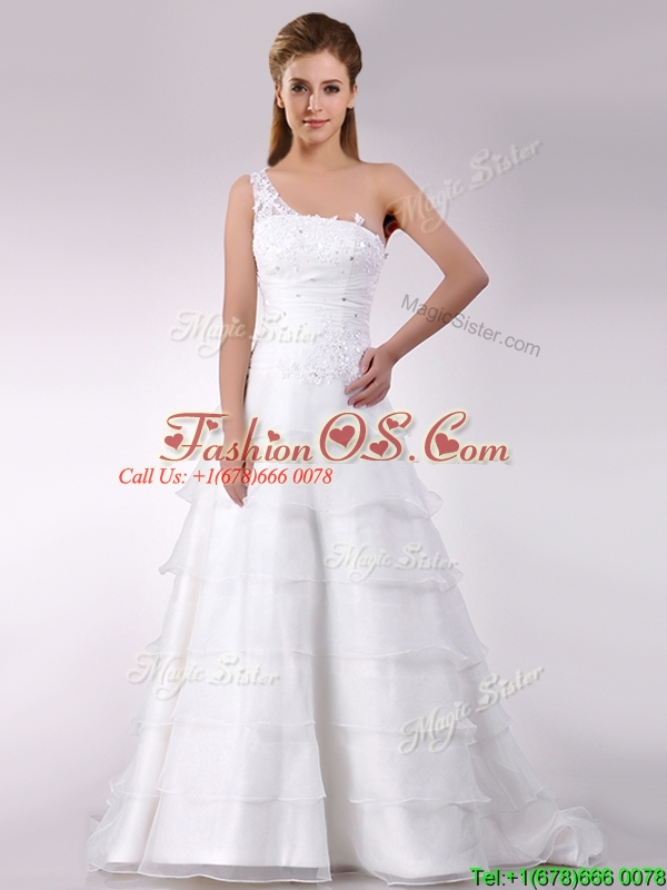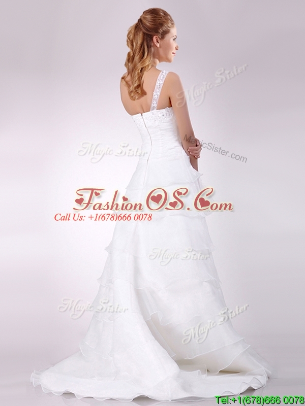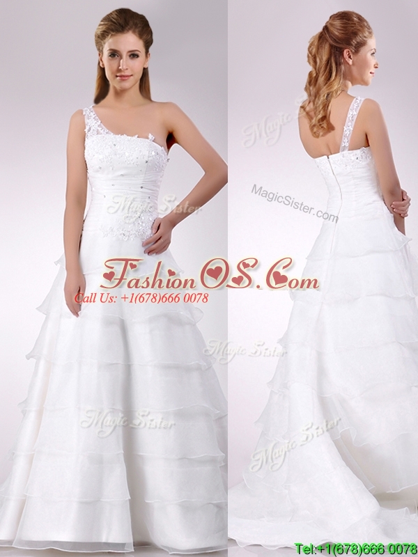 Home >  Wedding Dresses >  Romantic Wedding Dresses > Top Selling One Shoulder Beaded and Ruffled Layered Zipper Up Wedding Dress with Brush Train