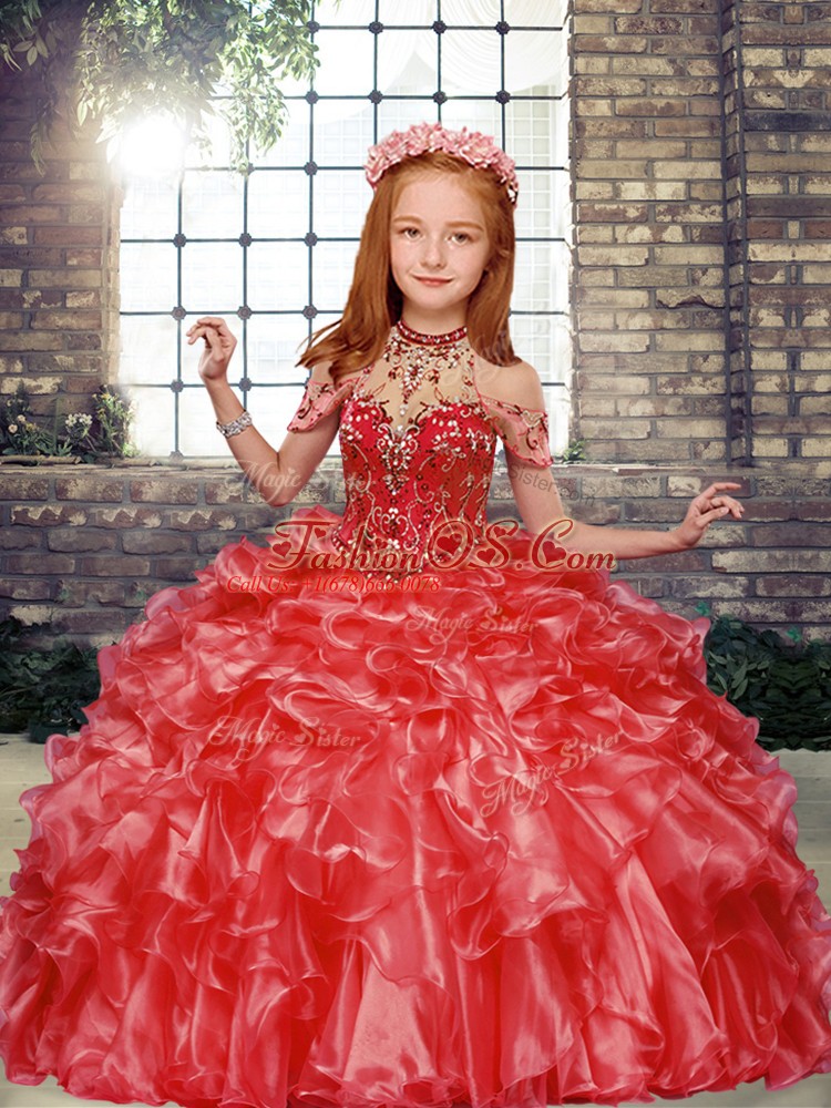Top Selling Red Girls Pageant Dresses Party and Wedding Party with Beading and Ruffles High-neck Sleeveless Lace Up