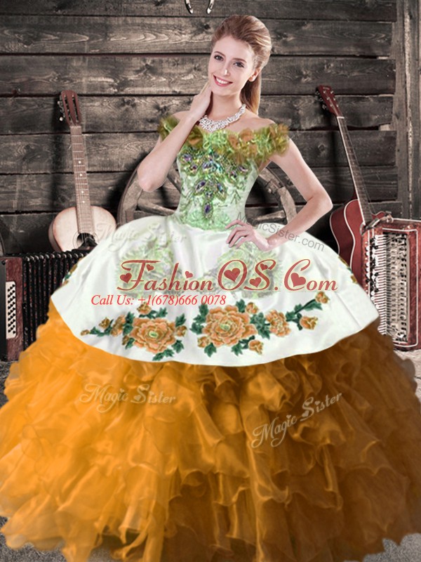 Traditional Floor Length Lace Up 15 Quinceanera Dress Brown for Sweet 16 and Quinceanera with Embroidery and Ruffles