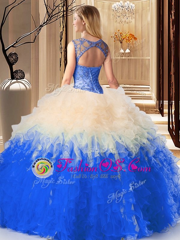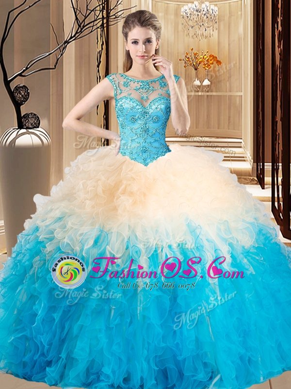 Traditional Multi-color Ball Gowns High-neck Sleeveless Tulle Floor Length Backless Beading and Ruffles Sweet 16 Dresses