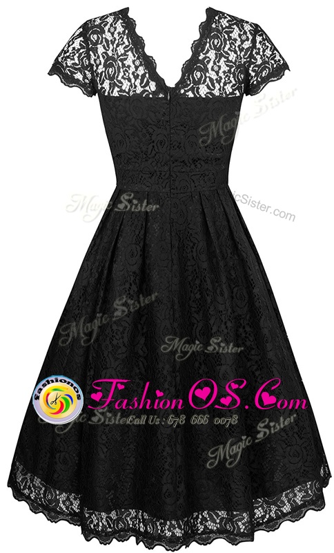 Traditional Scalloped Black Short Sleeves Chiffon Zipper Evening Dress for Prom and Party
