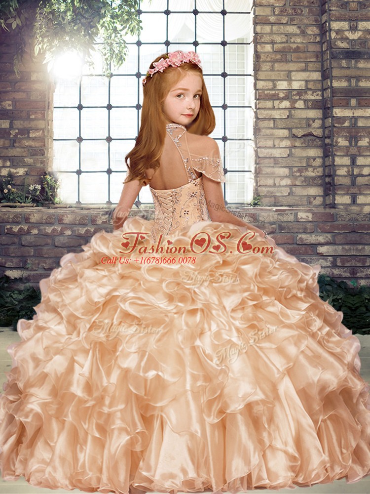 Trendy Blue Ball Gowns High-neck Sleeveless Organza Floor Length Lace Up Beading and Ruffles Little Girl Pageant Dress