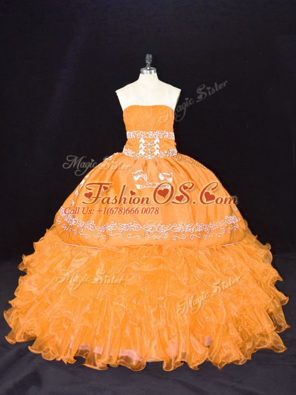 Trendy Floor Length Lace Up 15th Birthday Dress Gold for Sweet 16 and Quinceanera with Embroidery and Ruffles