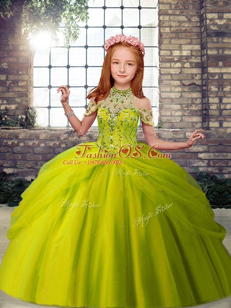 Trendy Halter Top Sleeveless Little Girls Pageant Gowns Floor Length Beading Olive Green Tulle