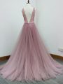 Trendy Pink A-line Tulle V-neck Sleeveless Beading and Belt Zipper Quinceanera Court Dresses Brush Train