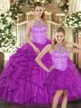 Trendy Purple Tulle Lace Up Halter Top Sleeveless Quinceanera Dresses Beading and Ruffles