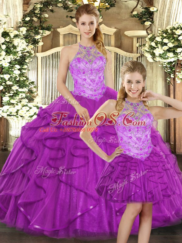 Home >  Quinceanera Dresses >  Detachable Quinceanera Skirts > Trendy Purple Tulle Lace Up Halter Top Sleeveless Quinceanera Dresses Beading and Ruffles