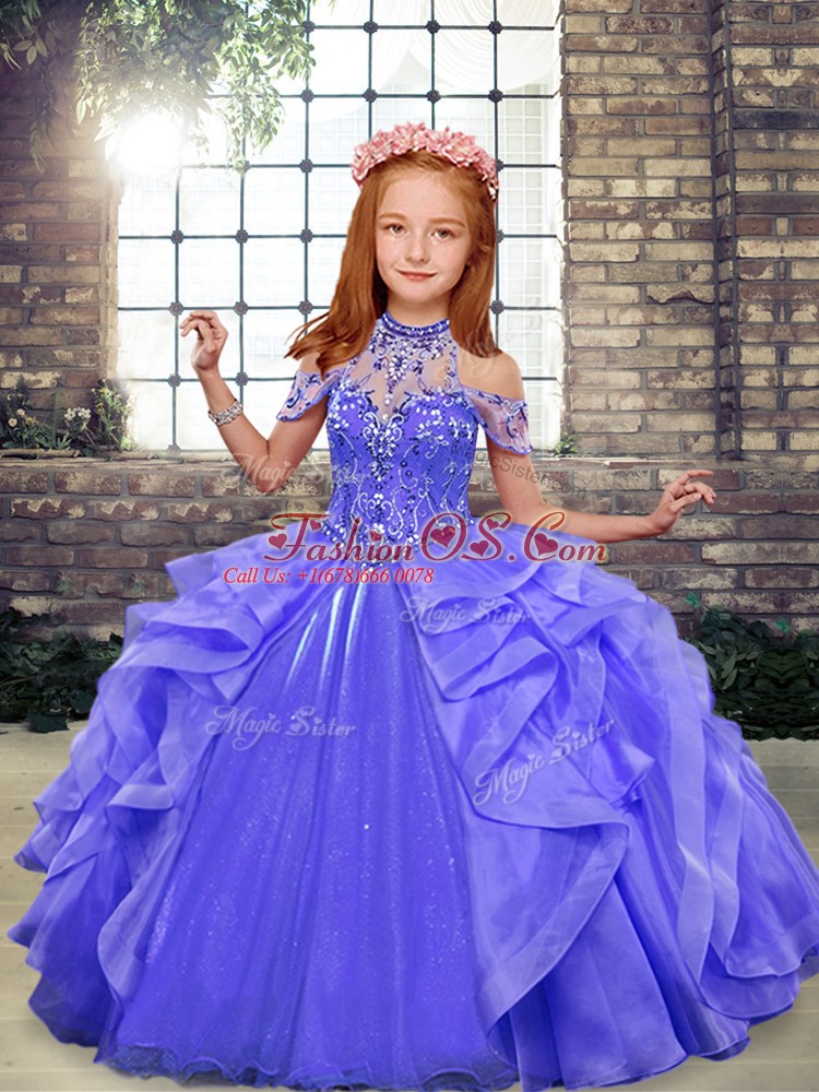 Trendy Sleeveless Organza Floor Length Lace Up Kids Formal Wear in Blue with Beading and Ruffles