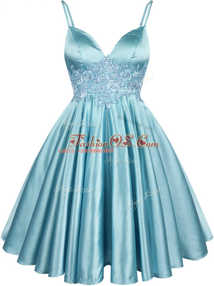 Trendy Spaghetti Straps Sleeveless Wedding Party Dress Knee Length Lace Aqua Blue Elastic Woven Satin