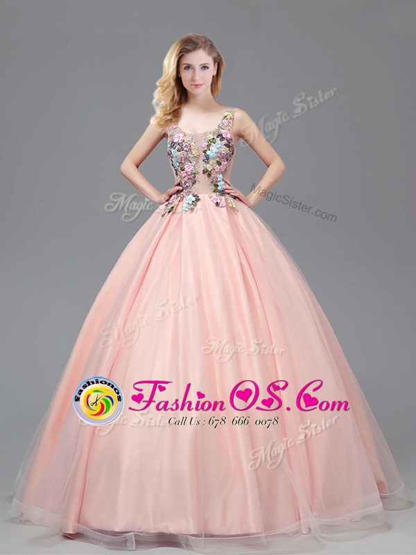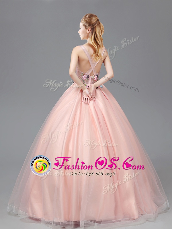 Trendy Straps See Through Baby Pink Sleeveless Floor Length Appliques Criss Cross 15th Birthday Dress