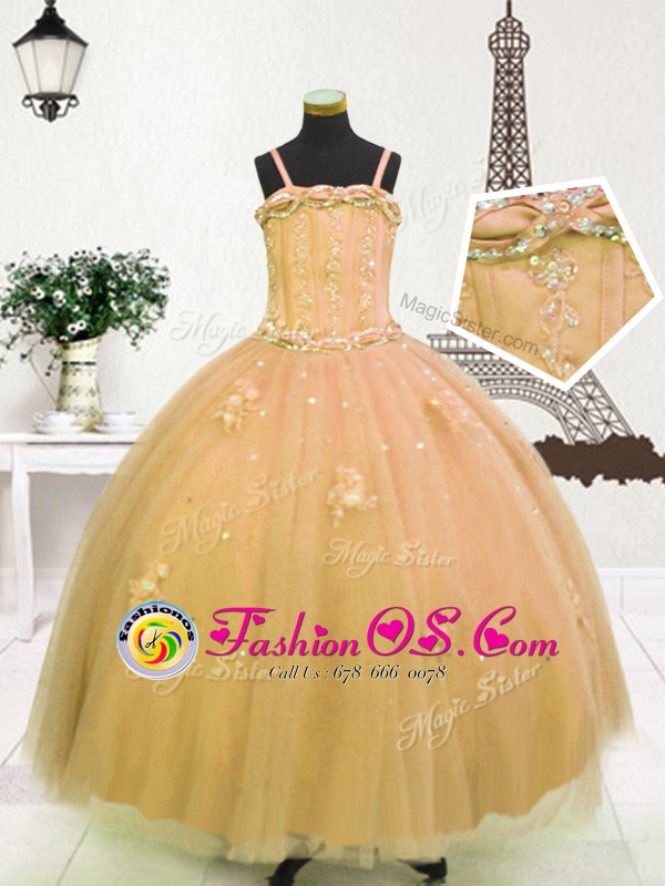 Trendy Tulle Sleeveless Floor Length Little Girls Pageant Gowns and Beading and Appliques