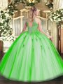 Tulle Halter Top Sleeveless Lace Up Lace and Appliques 15th Birthday Dress in Fuchsia