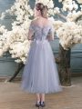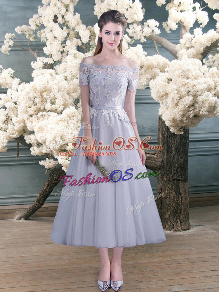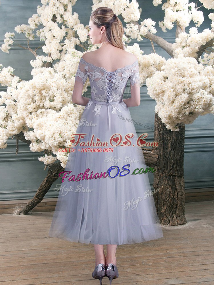 Tulle Off The Shoulder Short Sleeves Lace Up Lace and Appliques Prom Gown in Grey