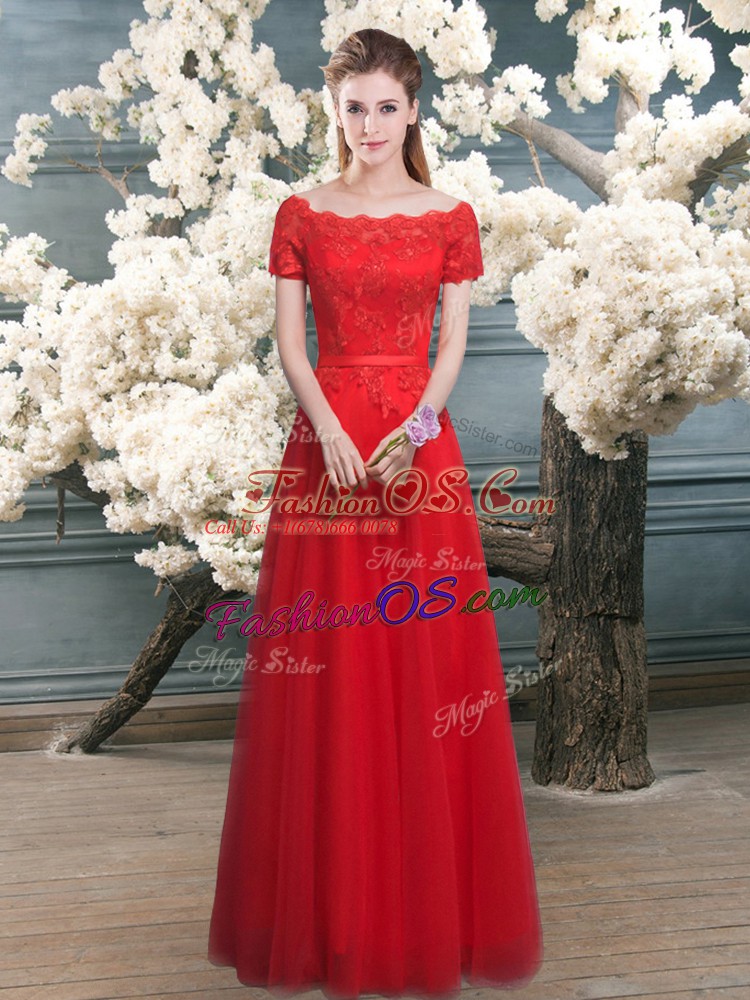 Tulle Off The Shoulder Short Sleeves Lace Up Lace Evening Dress in Red