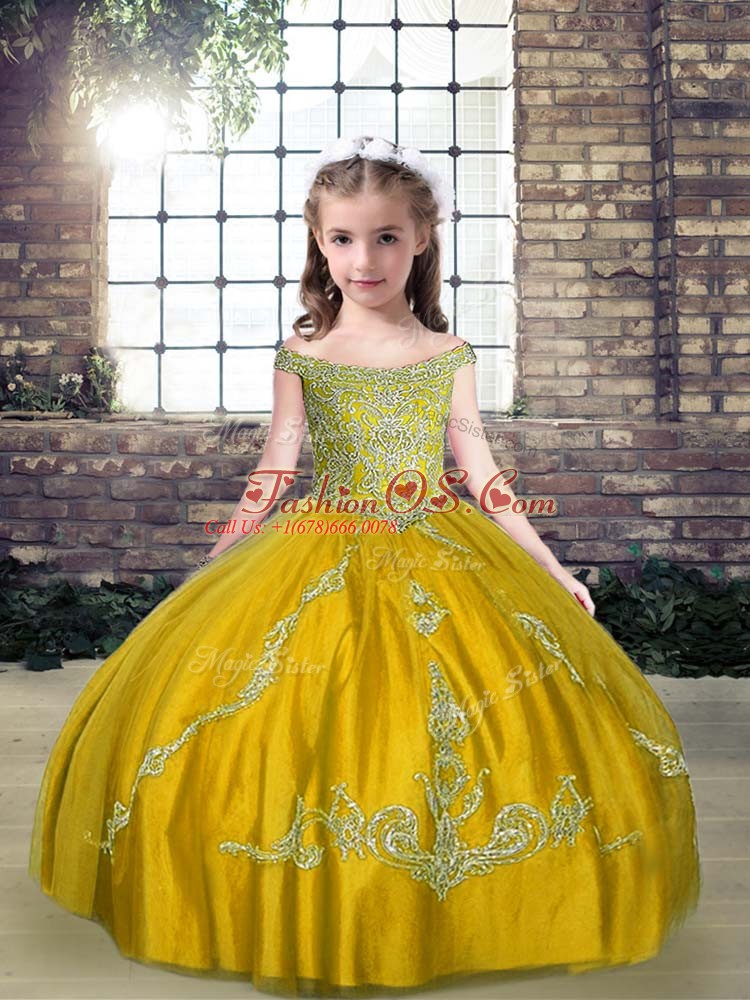Home >  Special Occasion Dresses >  Pretty Little Girl Pageant Dresses > Tulle Off The Shoulder Sleeveless Lace Up Beading Pageant Gowns For Girls in Olive Green
