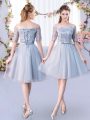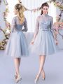 Tulle Scoop 3 4 Length Sleeve Lace Up Lace and Belt Bridesmaid Dresses in Grey
