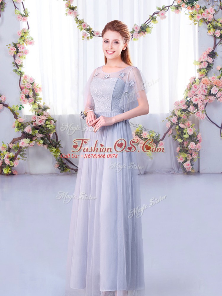 Home >  Bridesmaid Dresses >  Perfect Bridesmaid Dresses > Tulle Scoop Short Sleeves Side Zipper Lace and Belt Wedding Guest Dresses in Grey