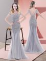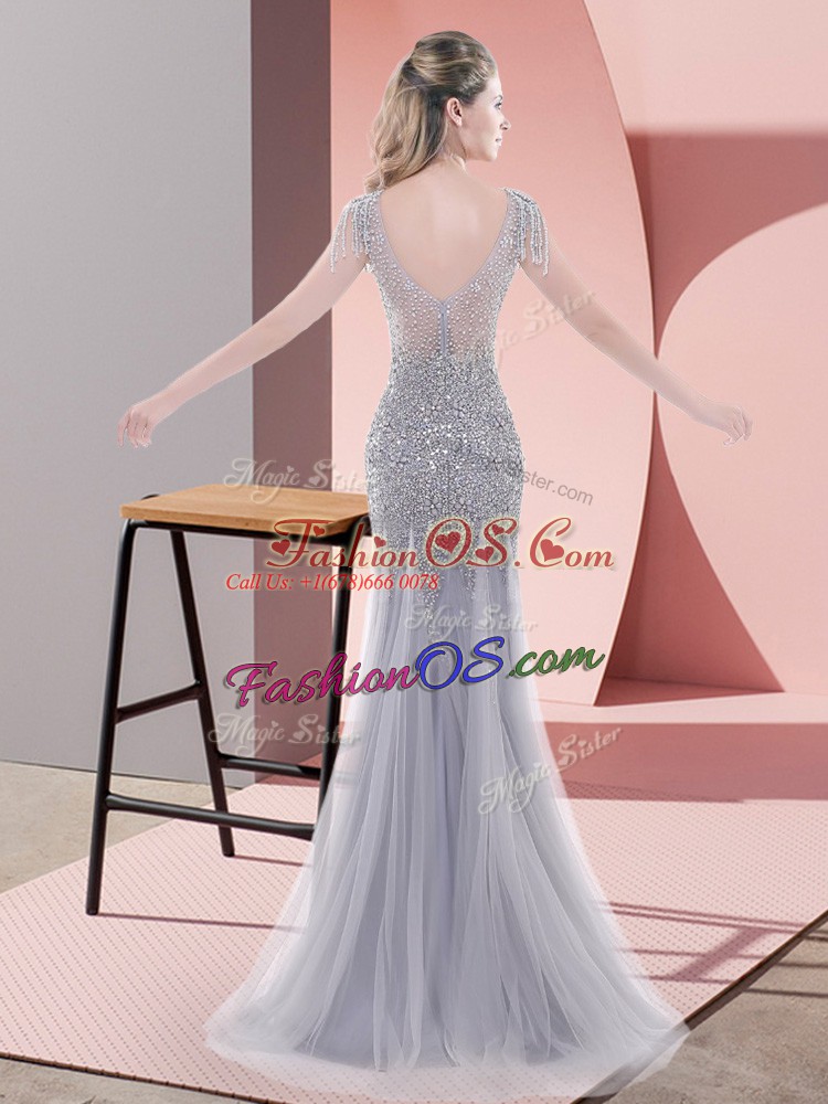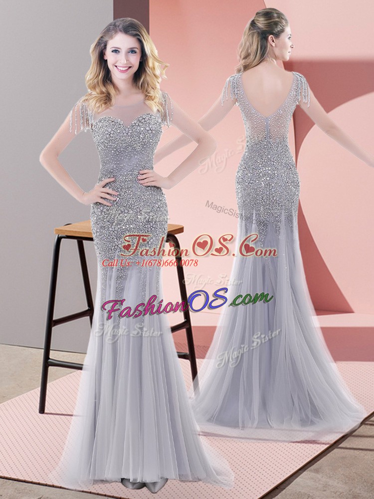 Tulle Scoop Short Sleeves Zipper Beading Prom Gown in Grey