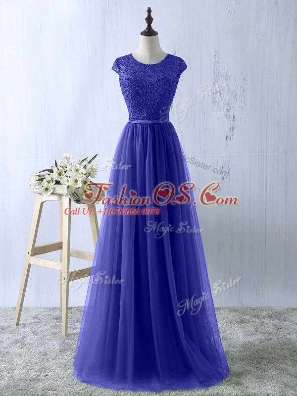 Tulle Scoop Short Sleeves Zipper Lace Prom Dress in Blue