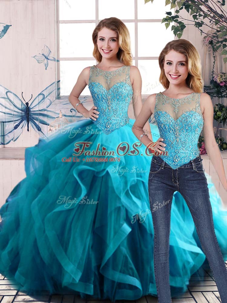 Tulle Scoop Sleeveless Lace Up Beading and Ruffles Quinceanera Gowns in Aqua Blue