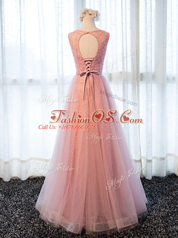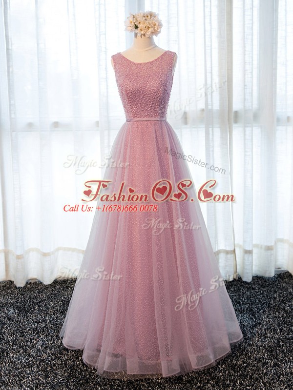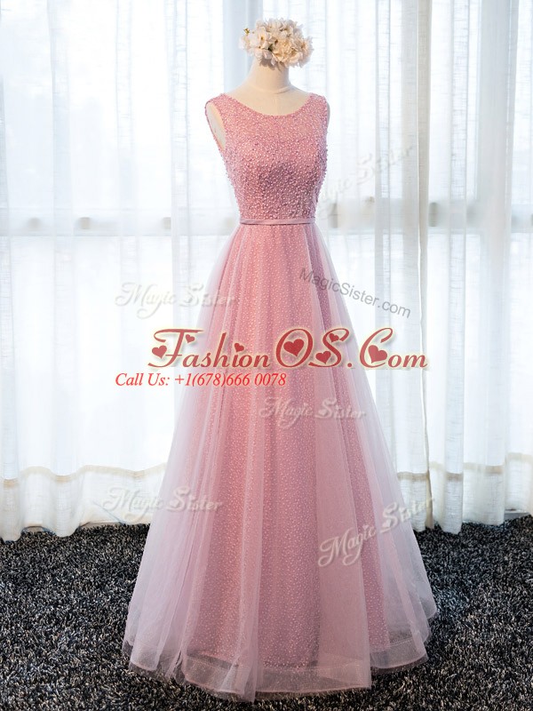 Tulle Scoop Sleeveless Zipper Beading and Belt Evening Dress in Pink