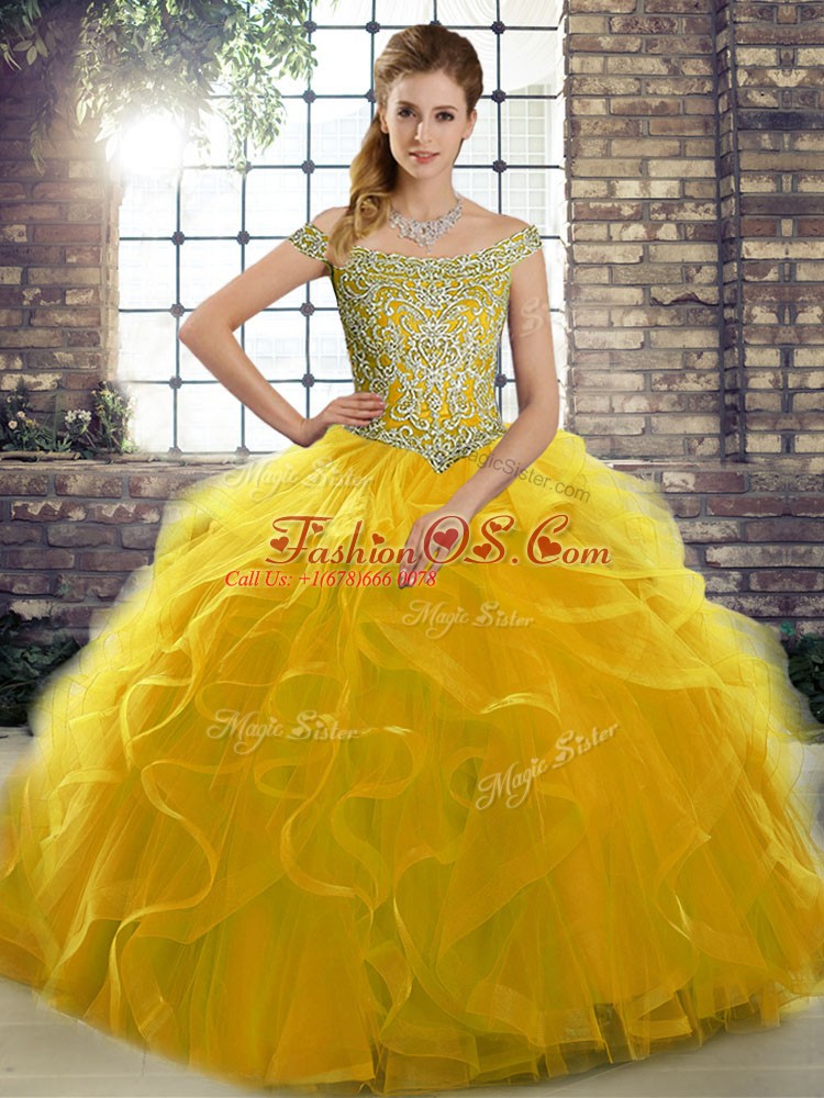 Home >  Quinceanera Dresses >  Fast Delivery Quinceanera Dresses > Tulle Sleeveless Sweet 16 Dress Brush Train and Beading and Ruffles