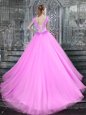 Tulle Straps Sleeveless Brush Train Lace Up Beading and Appliques Sweet 16 Quinceanera Dress in Fuchsia