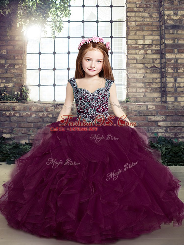 Tulle Straps Sleeveless Lace Up Beading and Ruffles Little Girls Pageant Dress in Purple