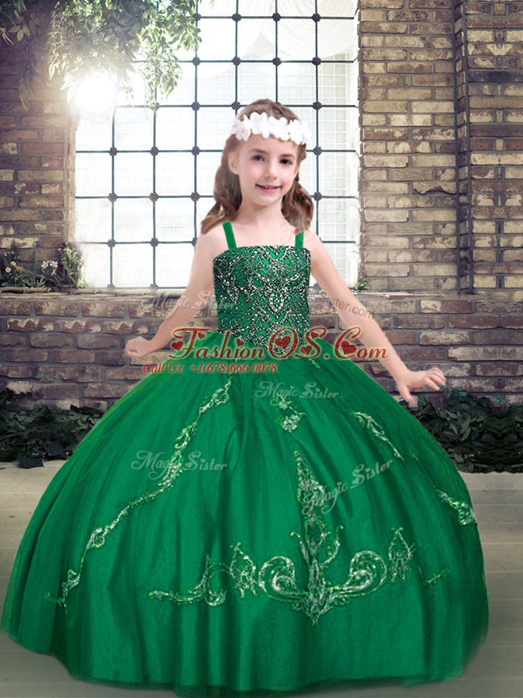 Tulle Straps Sleeveless Lace Up Beading Child Pageant Dress in Dark Green