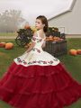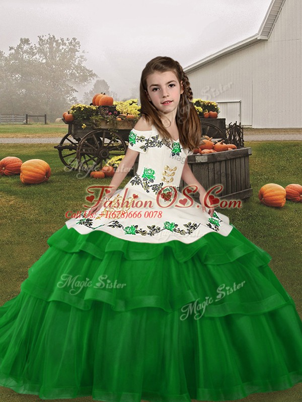 Tulle Straps Sleeveless Lace Up Embroidery and Ruffled Layers Kids Formal Wear in Green
