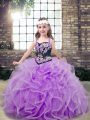 Tulle Straps Sleeveless Lace Up Embroidery and Ruffles Little Girls Pageant Gowns in Lavender