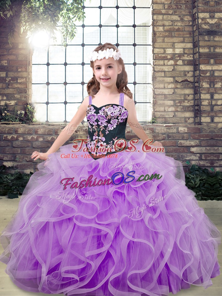 Home >  Special Occasion Dresses >  Lovely Little Girl Pageant Dresses > Tulle Straps Sleeveless Lace Up Embroidery and Ruffles Little Girls Pageant Gowns in Lavender